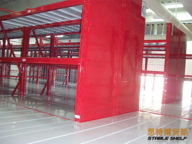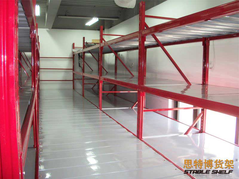 閣樓貨架系統(tǒng),通常利用中型擱板式貨架或重型擱板式貨架作為主體支撐加上樓面板(根據(jù)貨架單元的總負(fù)載重量來決定使用何種貨架),樓面板通常使用冷軋型鋼樓板、花紋鋼樓板或鋼格柵樓板。
