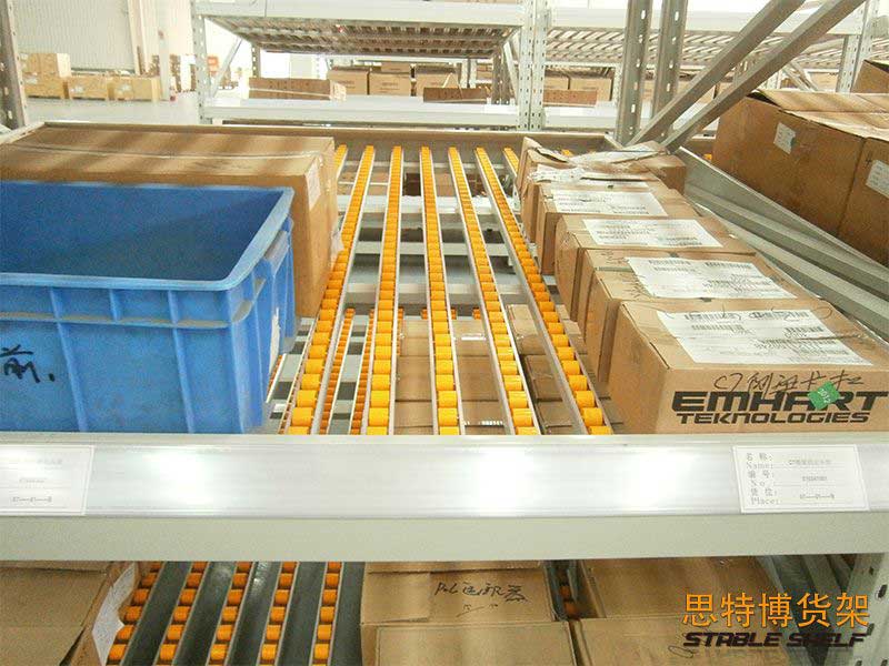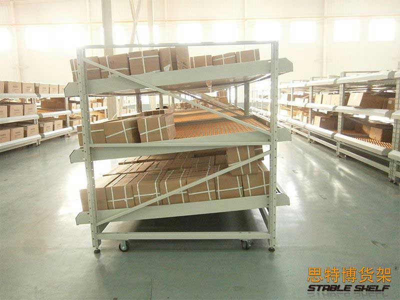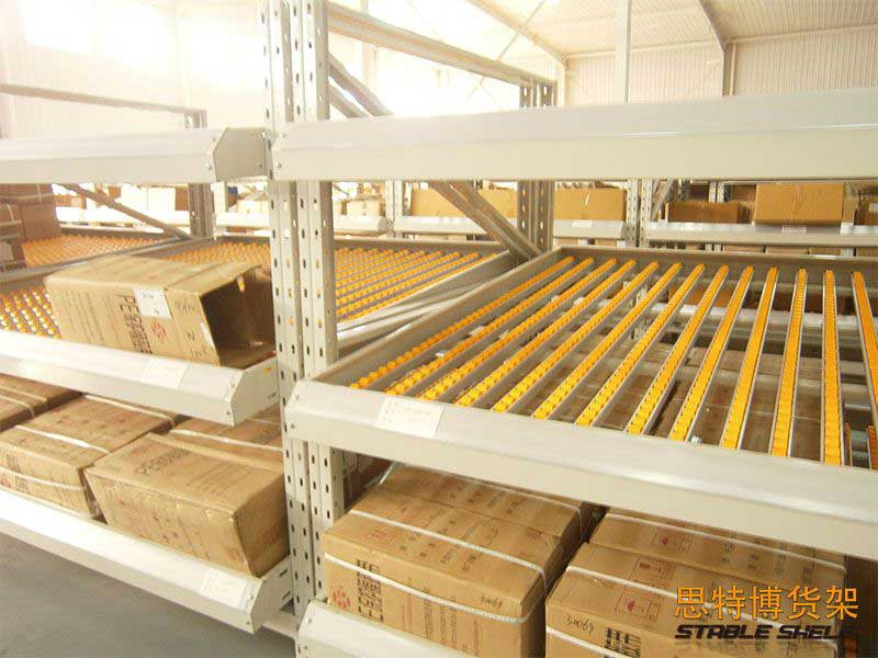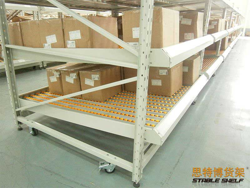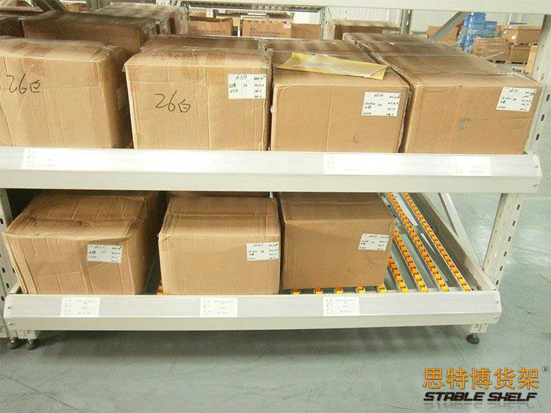 流利式貨架又稱(chēng)滑移式貨架,采用輥輪鋁合金,鈑金等流利條,利用貨物臺(tái)架的自重,從一邊通道存貨,另一邊通道取貨實(shí)現(xiàn)先進(jìn)先出,存儲(chǔ)方便,以及一次補(bǔ)貨多次取貨。流利架存儲(chǔ)效率高,適合大量貨物的短期存放和揀選??膳潆娮訕?biāo)簽,實(shí)現(xiàn)貨物的輕松管理,常用滑動(dòng)容器有周轉(zhuǎn)箱,零件盒及紙箱,適合大量貨物和短期存放和揀選。廣泛應(yīng)用于配送中心、裝配車(chē)間以及出貨頻率較高的倉(cāng)庫(kù)。