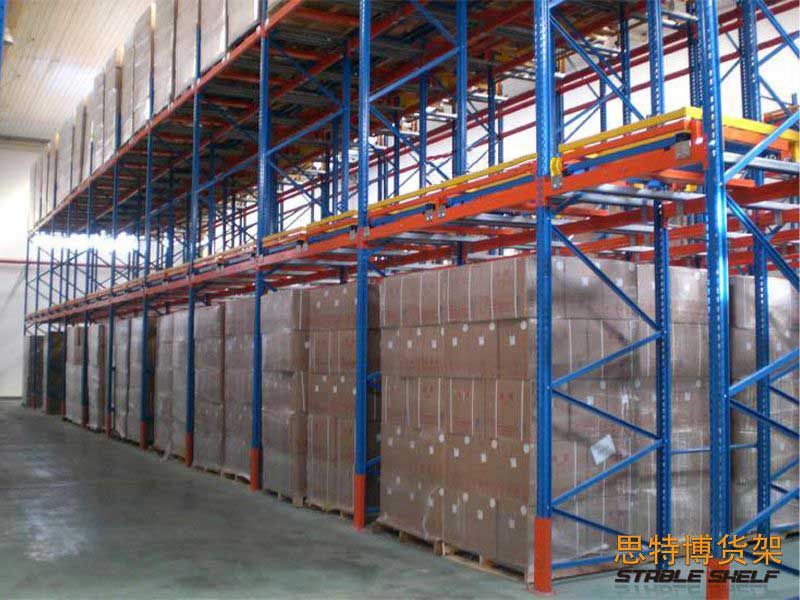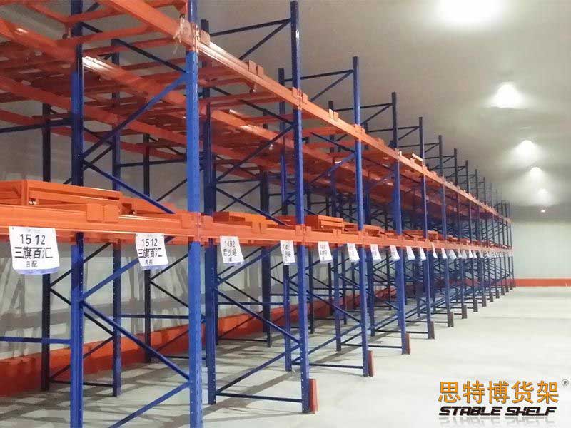 Push-in shelves, also known as push-back shelves, are overlapped between the front and back beams with multi-layer carts, and the stacked goods are placed in the carts from the outside, and the stored goods will push the original goods inside. The push-in shelf is composed of typical structural parts such as a pallet car. The pallet car has flowable characteristics, and the goods are specified to enter and exit at one end of the shelf, and follow the first-in-last-out order. When storing and transporting goods, the forklift only works at the lower end of the shelf aisle and does not need to enter the shelf goods storage aisle. Such shelves have the typical characteristics of high storage density and fast storage and transportation speed. It is usually used in situations where the storage space is extremely limited, but the storage capacity needs to be increased or the goods have time requirements, and the requirements for cargo selection are not high. The advantage of the pressed type is to save the number of operation channels, the forklift is not high, can effectively improve the utilization rate, mainly used in the warehouse space is insufficient, and the area of the warehouse is not large; And the goods must fit the position that can be first in, last out.