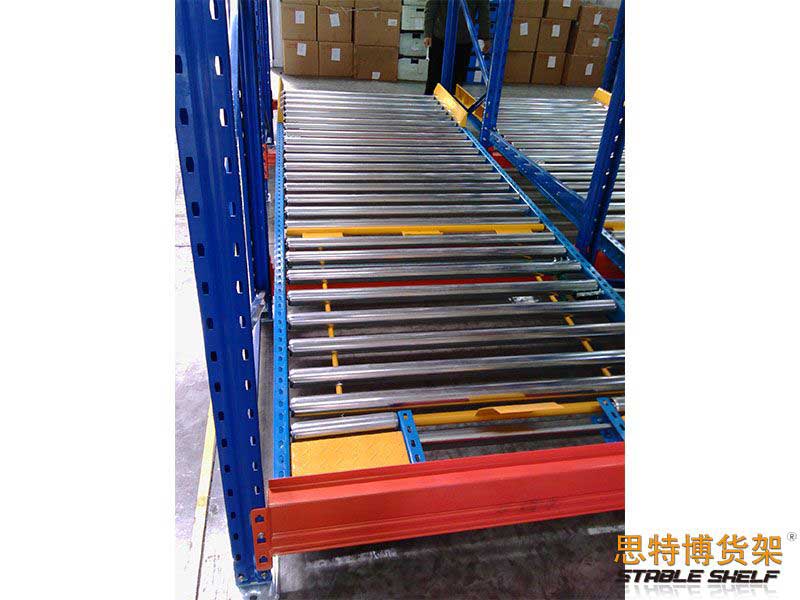 重力式貨架又叫輥道式貨架,屬于倉儲貨架中的托盤類存儲貨架。重力式貨架是橫梁式貨架衍生品之一,貨架結(jié)構(gòu)與橫梁式貨架相似,只是在橫梁上安上滾筒式軌道,軌道呈3-5°傾斜。托盤貨物用叉車搬運至貨架進貨口,利用自重,托盤從進口自動滑行至另一端的取貨口。重力式貨架屬于先進先出的存儲方式。