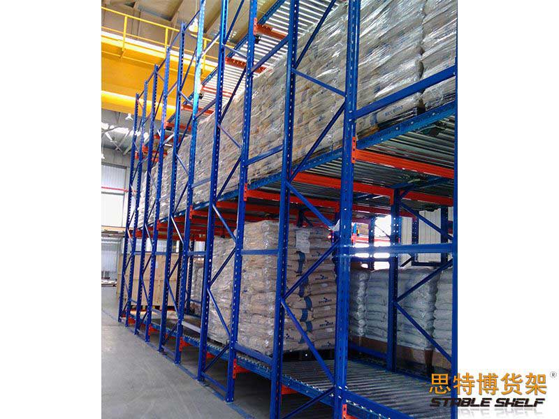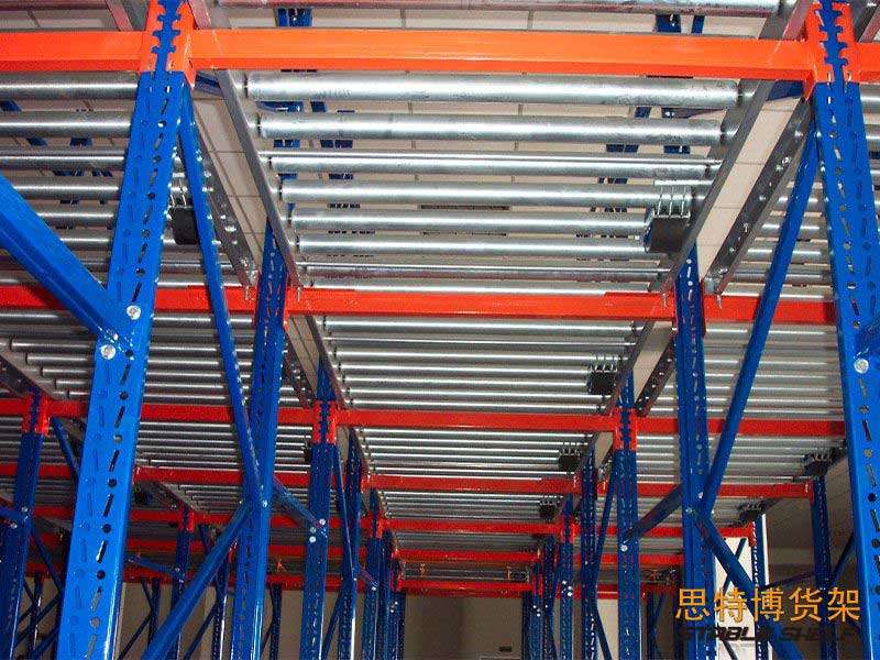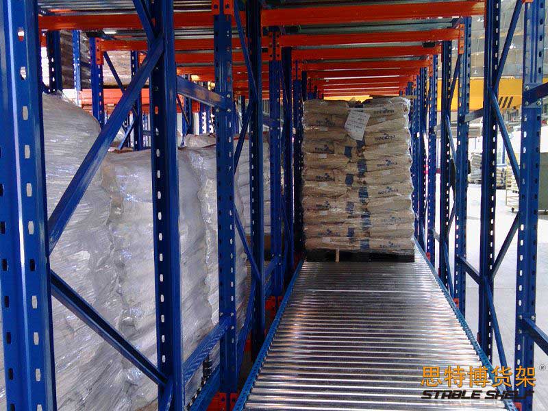 在貨架的組與組之間沒有作業(yè)通道,從而增加了60%的空間利用率,提高了倉儲的容積率;托盤操作遵循先進先出的原則;自動儲存回轉(zhuǎn);儲存和揀選兩個動作的分開大大提高輸出量,由于是自重力使貨物滑動,而且沒有操作通道,所以減少了運輸路線和叉車的數(shù)量