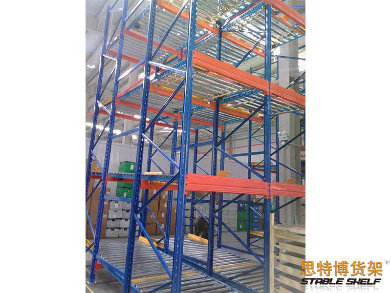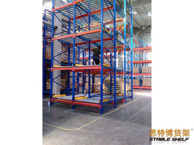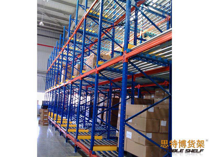 重力式貨架由托盤式貨架演變而成,采用滾筒式軌道或底輪式托盤。